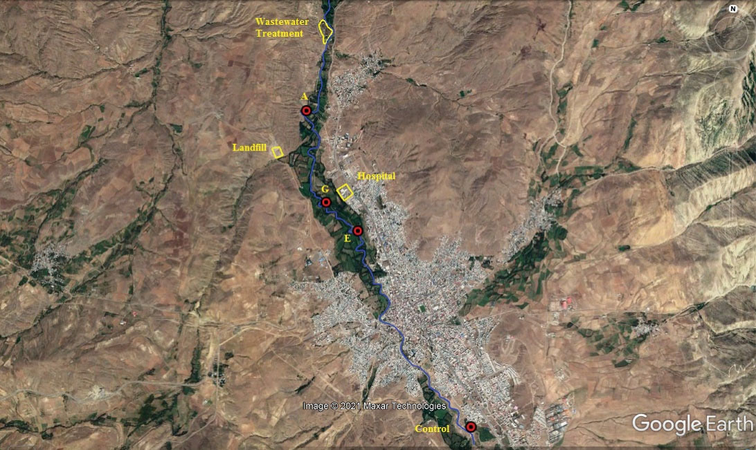 We conducted this study in Khalkhal, Ardabil Province, northwestern Iran (Fig. 1). Khalkhal has been located at longitude 48 degrees and 32 minutes and 37 minutes and 37 degrees latitude of the Greenwich meridian. Its height is 1843 m above sea level with a mean annual temperature of 7°C and a mean annual rainfall of 289 mm. Khalkhal landfill is located 5 km from the city and along Herochai river. The height of this area from the groundwater level is 60 m in the city and along the Herochai river. The distances of sampling points in the upstream well (4600 m), three downstream wells (500, 1600, and 685 m), and upstream and downstream points of the Herochai river (950 and 750 m, respectively) from the landfill were different. The selected points for sampling were the nearest (except for stations upstream of the river and upstream well) available points to the landfill.