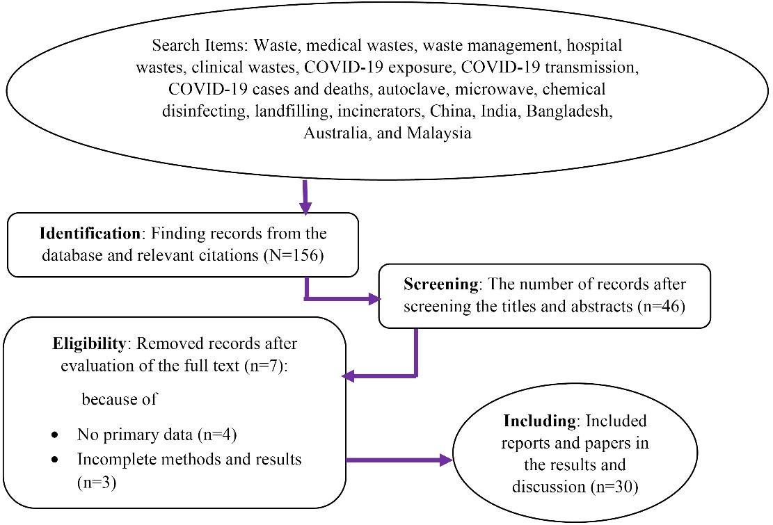 All published reports and papers, mostly until 2020, that evaluated the relationship between COVID-19 incidences and medical wastes were gathered and reviewed to present the status of medical wastes before and during the COVID-19 pandemic. The same process was used for the evaluation of recommended disinfecting devices. Due to the irregular situation at the beginning of the pandemic, the generation rate of medical waste was at the highest amount; therefore, the early months of 2020 were considered in this study. Information was obtained from Web of Science, Scopus, PubMed, Google Scholar, The World Health Organization (WHO), and relevant websites. In the first step, the following items were searched to find appropriate documents: Waste, medical wastes, waste management, hospital wastes, clinical wastes, COVID-19 exposure, COVID-19 transmission, COVID-19 cases and deaths, autoclave, microwave, chemical disinfecting, landfilling, incinerators, China, India, Bangladesh, Australia, and Malaysia. In the current study, the total number of documents included 39 references of which 30 references were used and analyzed in the results and discussion section (Fig. 1). The results and discussion of the study were evaluated in two sections: (a) The generation rate of medical waste before and during the COVID-19 pandemic and (b) Disinfecting methods of medical wastes during the COVID-19 pandemic.